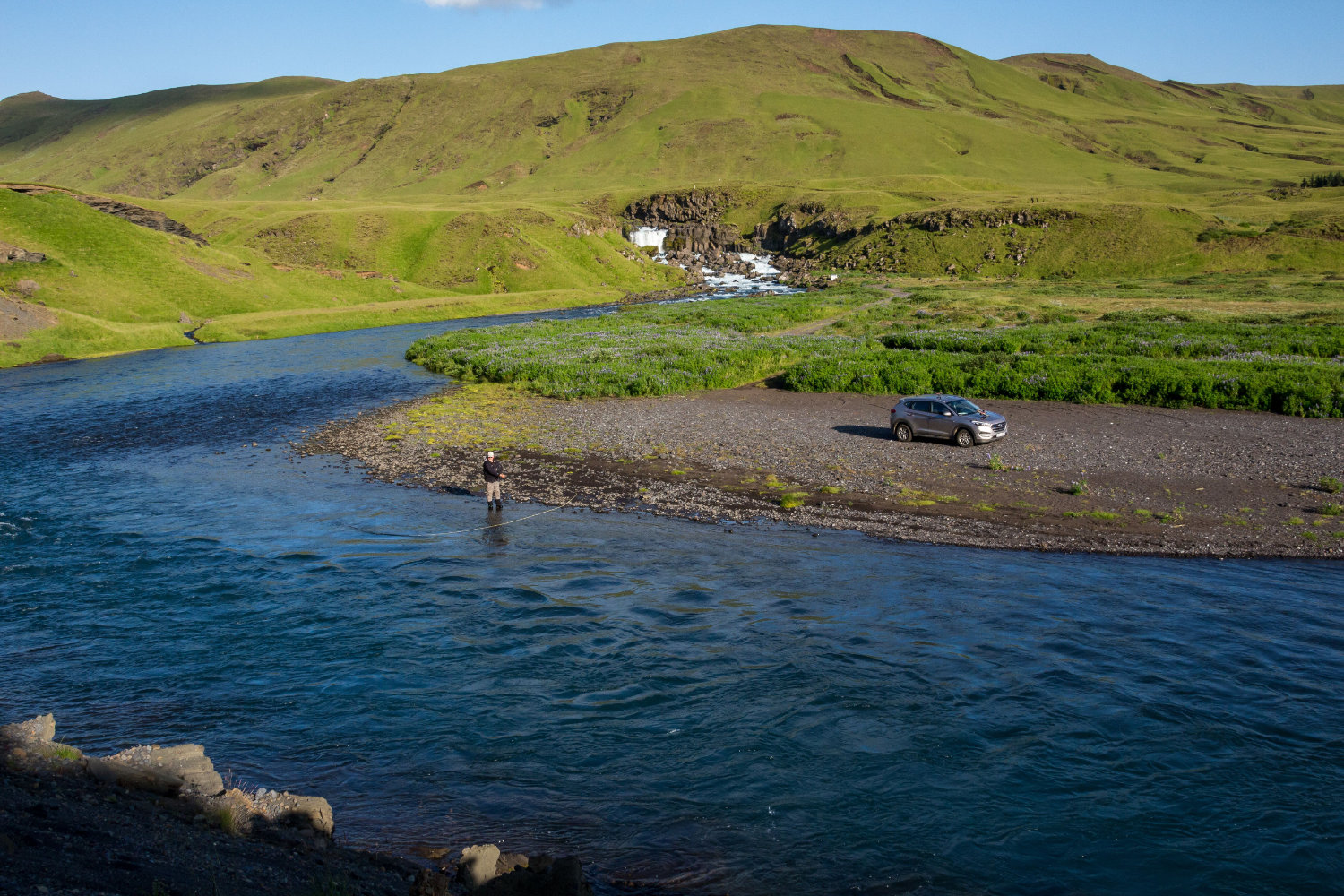 The East Ranga river and lodge are located in a beautiful setting. The river drops from a stunning waterfall down through the varying beats, and eventually meets the West Ranga to form Holsa at the estuary. Standing over the East Ranga valley is the now infamous Eyjarfjallajokl glacier and volcano, which erupted so dramatically in 2010, and its even older and larger sister, Hekla. The meadow river valley is teeming with birdlife and July sees the river lined with purple lupins.